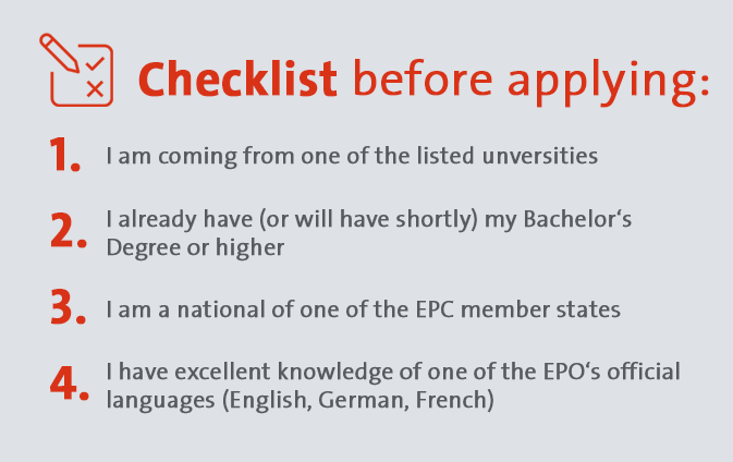 The EPO Young Professionals Programme welcomes talented students and graduates from these universities across all academic disciplines to help shape the future of innovation. Whether you come from a STEM background or a field such as business administration, law, or communication, you will find unique opportunities to contribute your expertise.